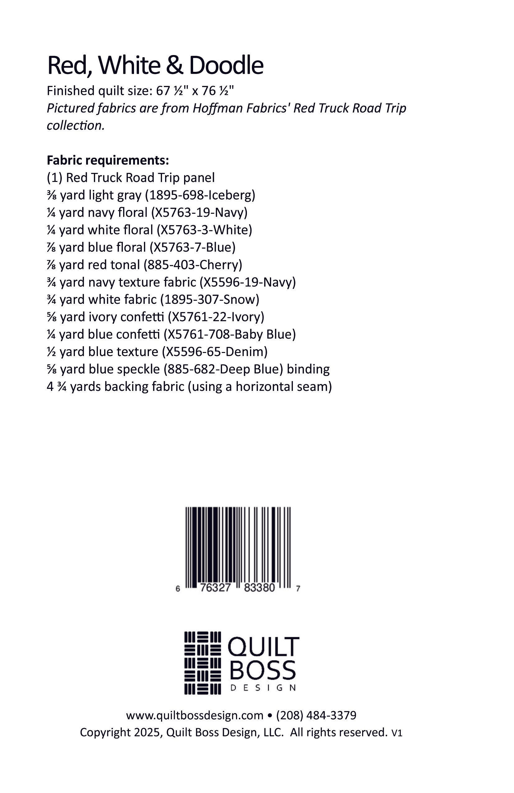 Bunting flutters, wheels roll, and summer joy rides shotgun in this pattern that makes use of a large patriotic panel (~42" x 38") from Hoffman Fabric's Red Truck Road Trip collection. It's a patchwork parade of freedom, fun, and a little small-town sparkle. The finished quilt is 67-1/2" x 76-1/2".