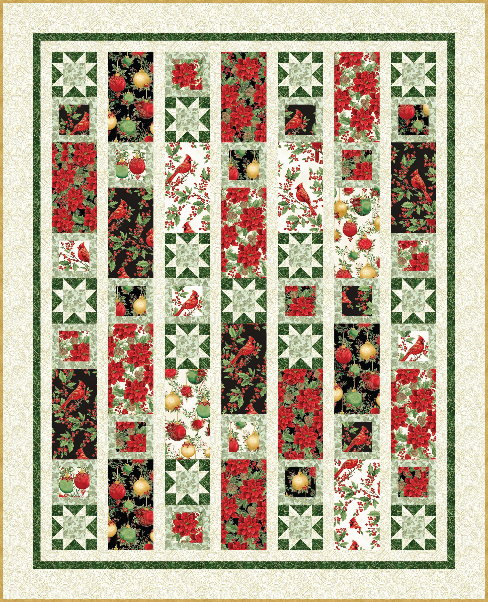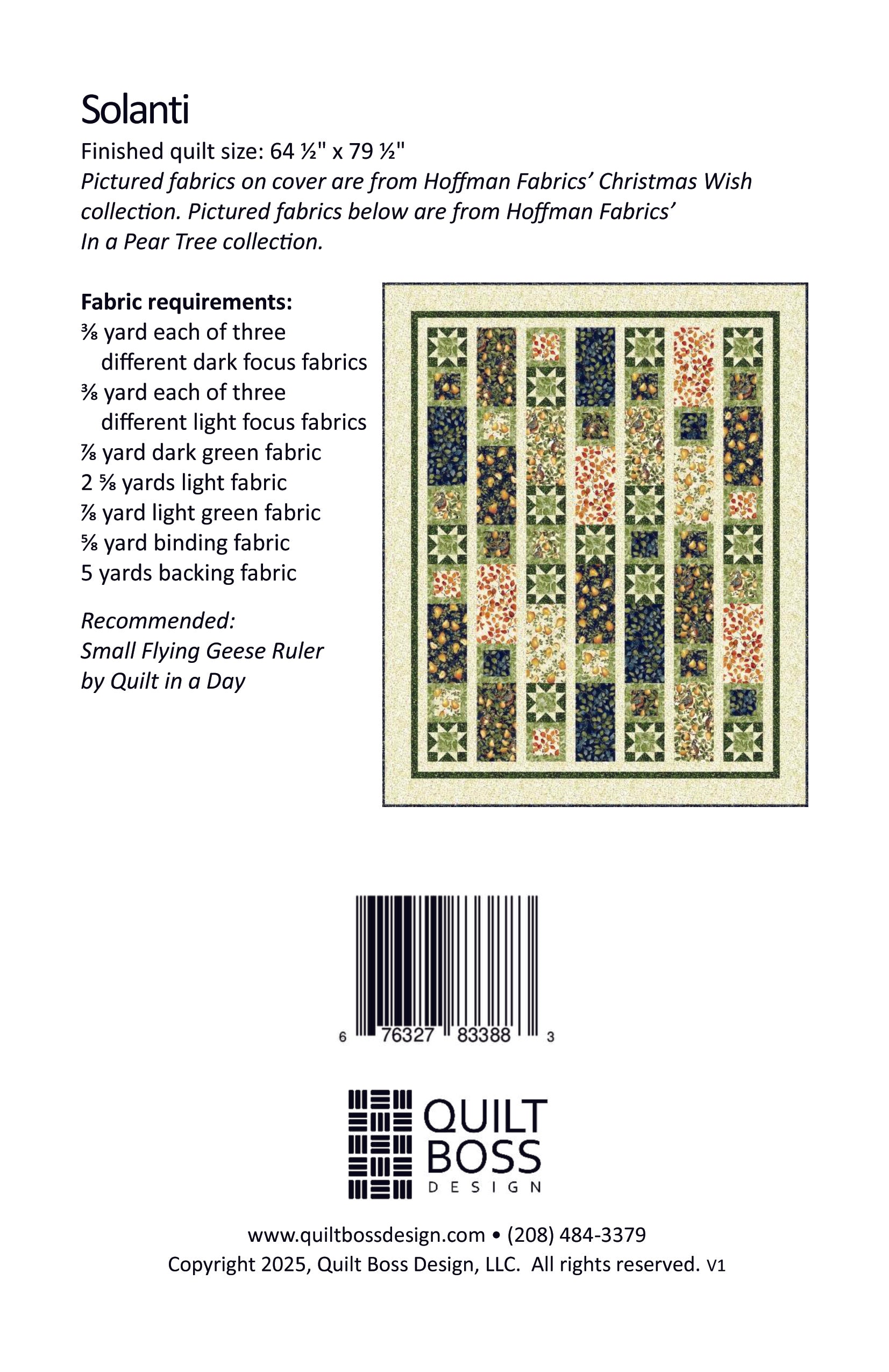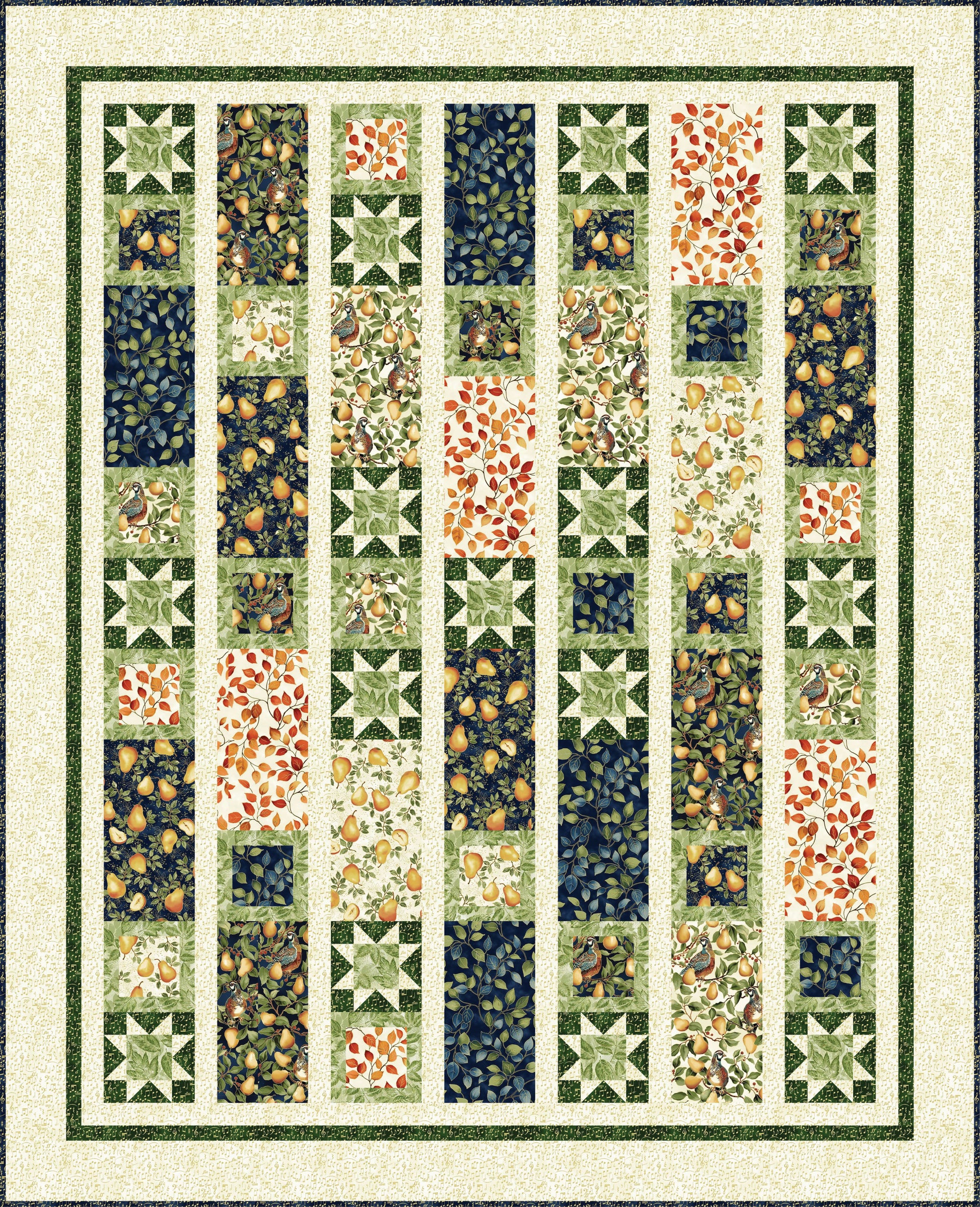 Show off your favorite fabric collection with this eye-catching quilt pattern featuring simple stars, pieced blocks, and generous rectangles that let the fabrics shine. The design uses three dark and three light focus prints, complemented by a few coordinating blenders, for a balanced and striking effect. The pattern includes two colorways, both showcasing Hoffman Fabrics’ In a Pear Tree collection. Finished size: 64½" x 79½". A Small Flying Geese Ruler by Quilt in a Day is recommended.
