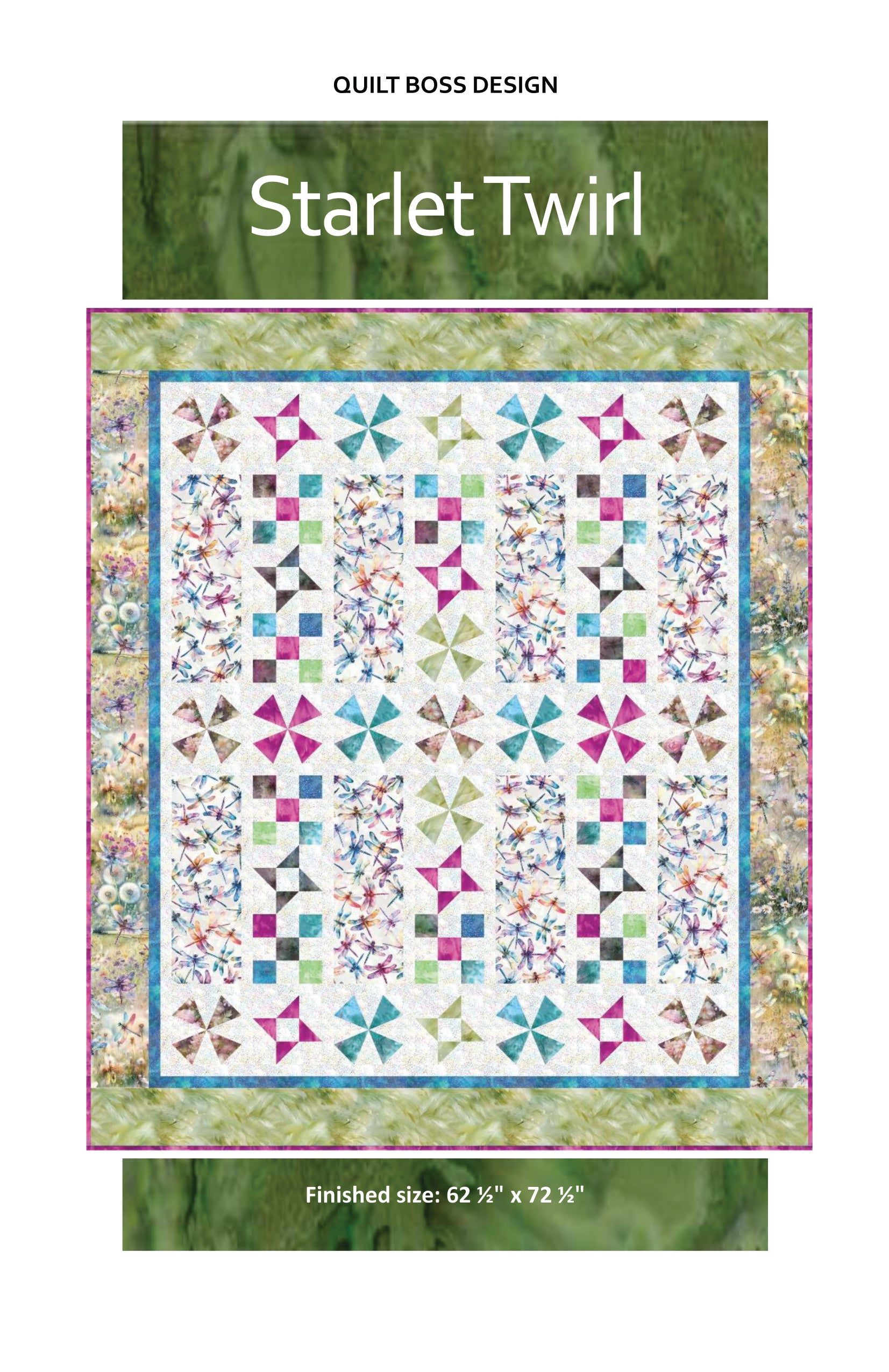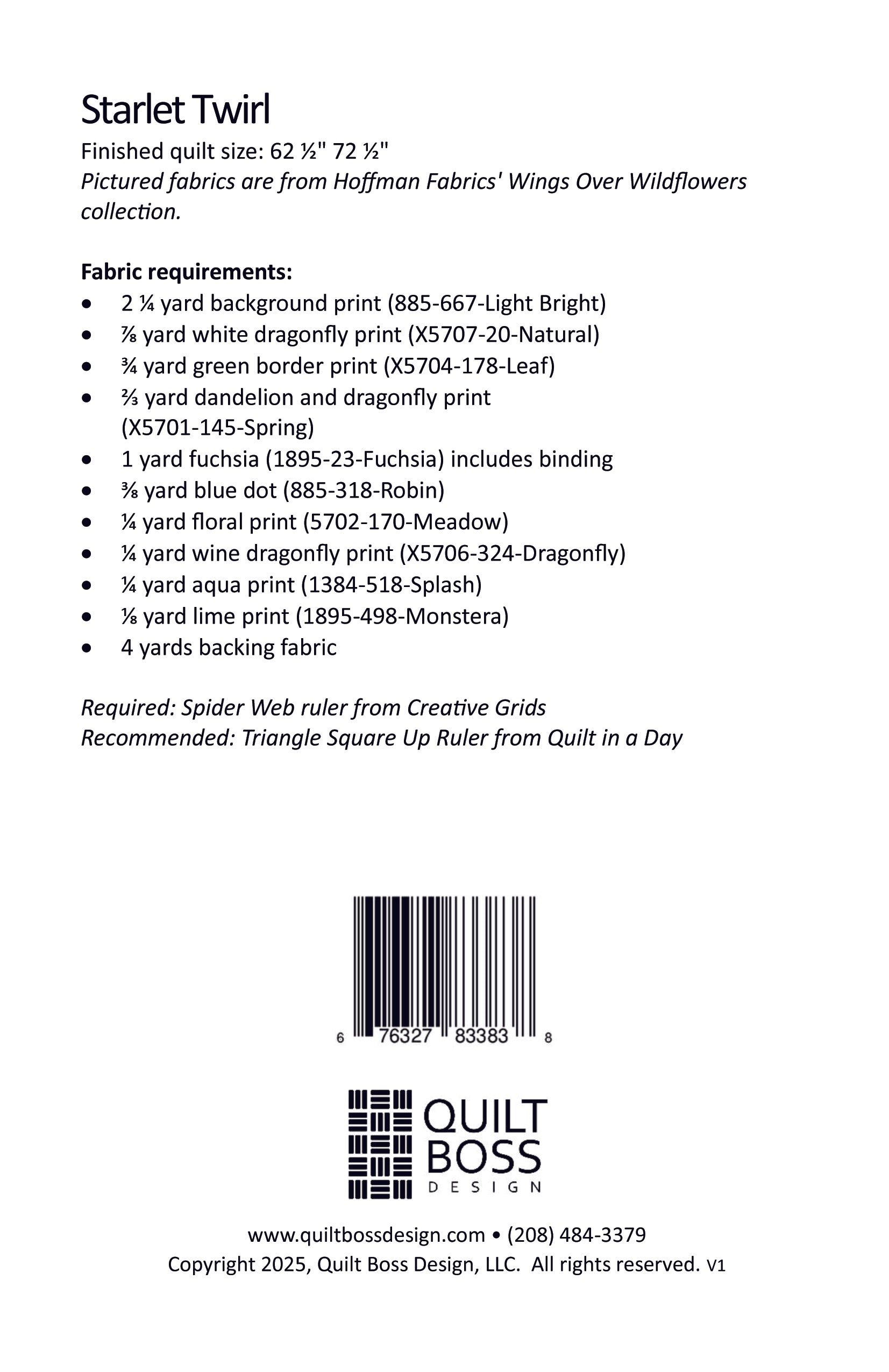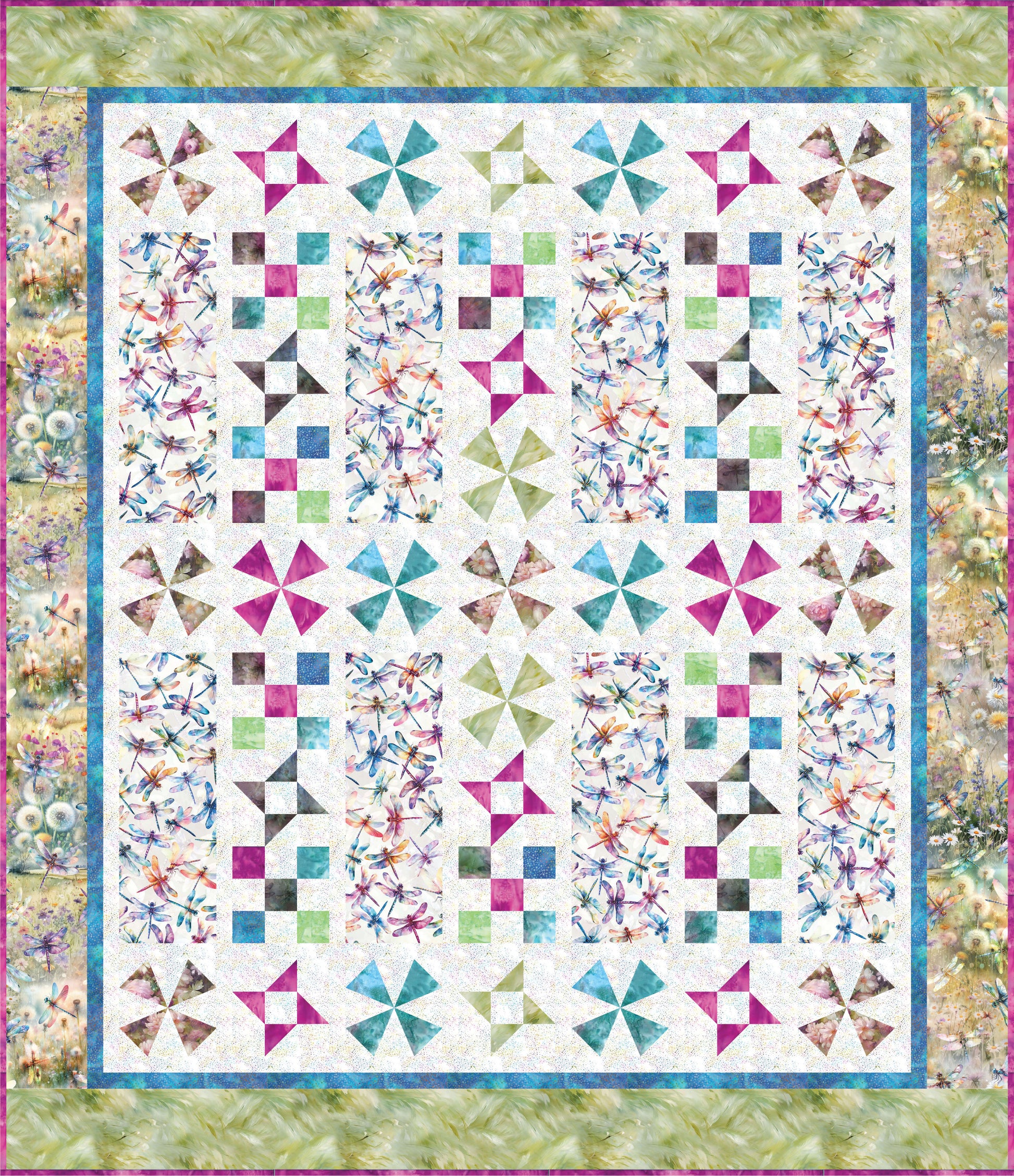 Playful prints of dragonflies dance across bright pops of fuchsia, aqua, and meadow greens, while delicate florals add texture and motion. Measuring 62 ½" x 72 ½", this breezy design blends kaleidoscope blocks, classic 9-patches, and friendship stars into a joyful patchwork celebration. Fabrics in the quilt picture are from Hoffman Fabrics' Wings Over Wildflowers collection.