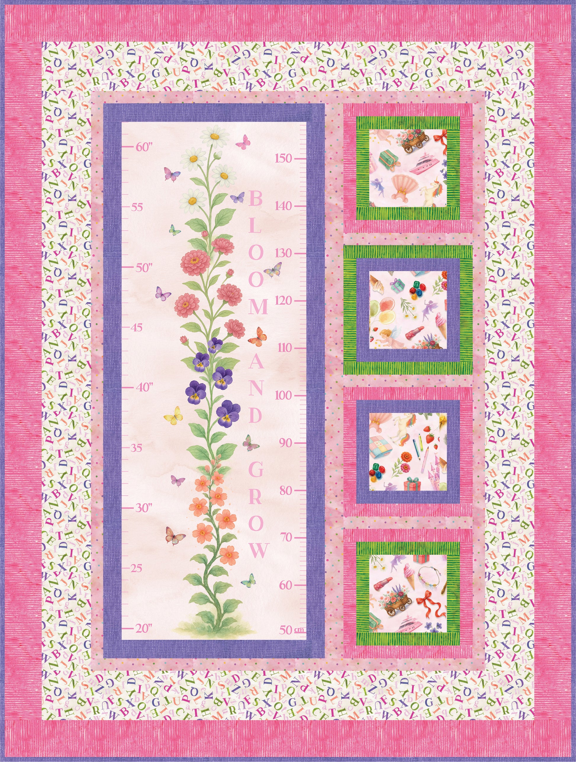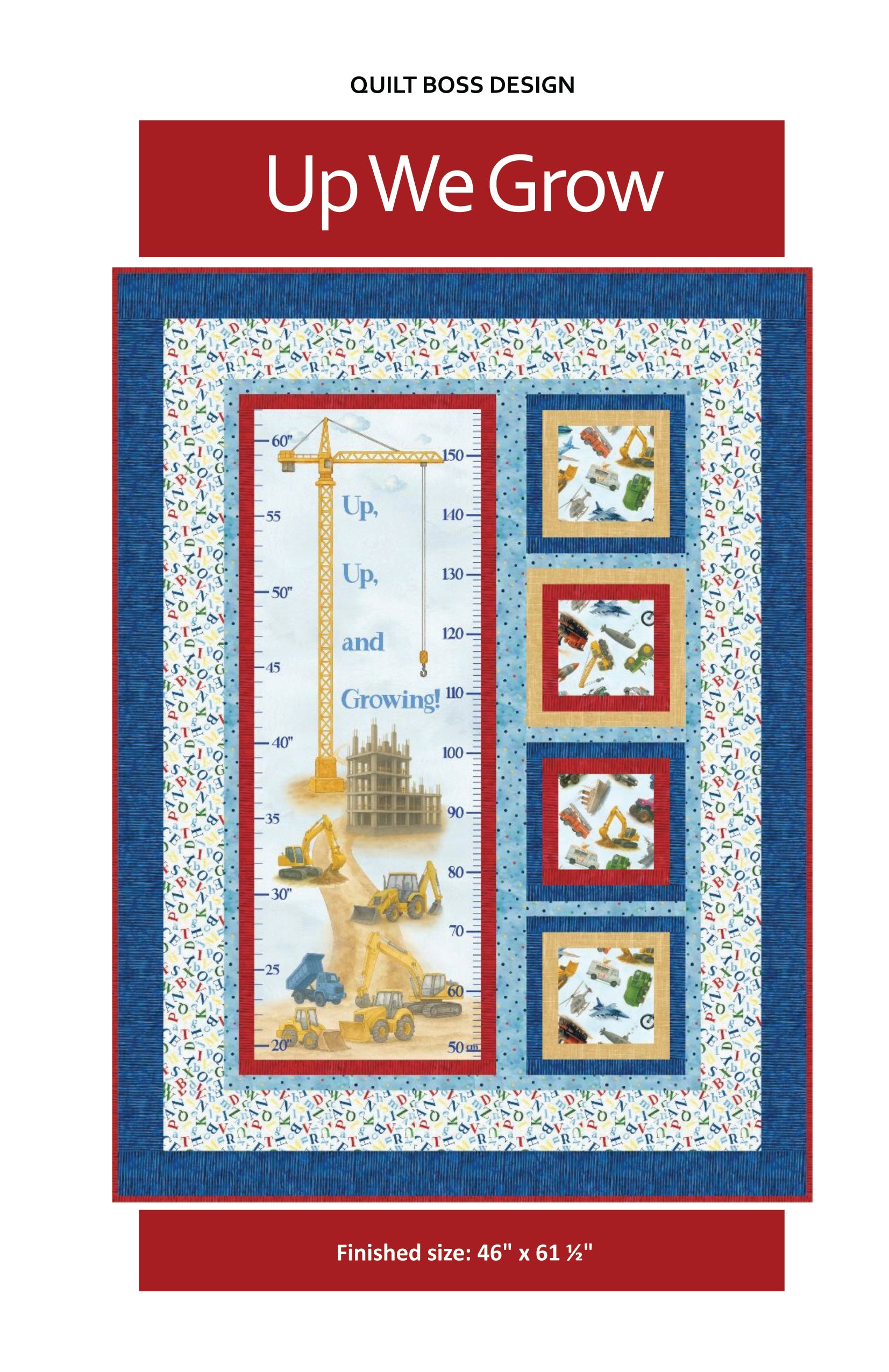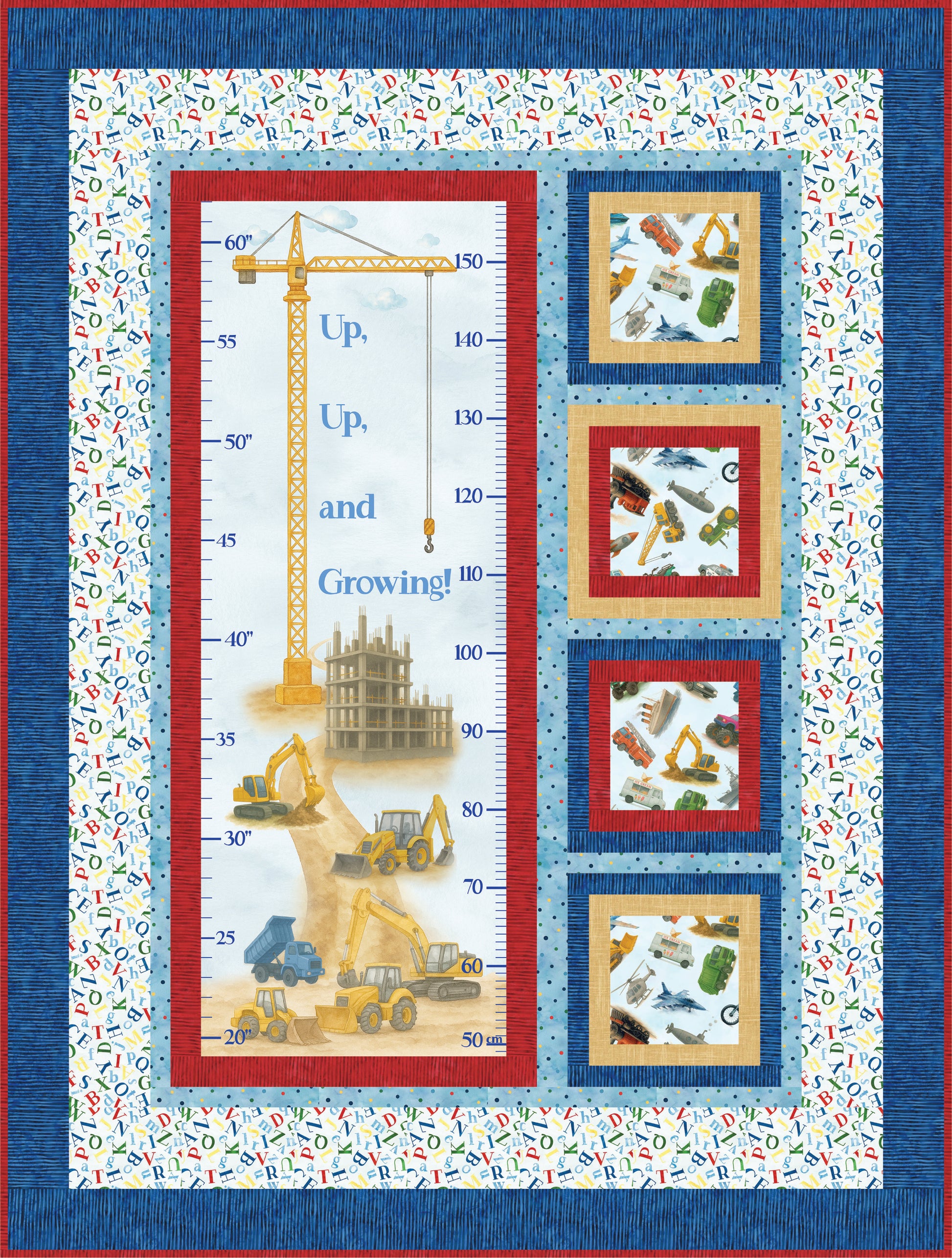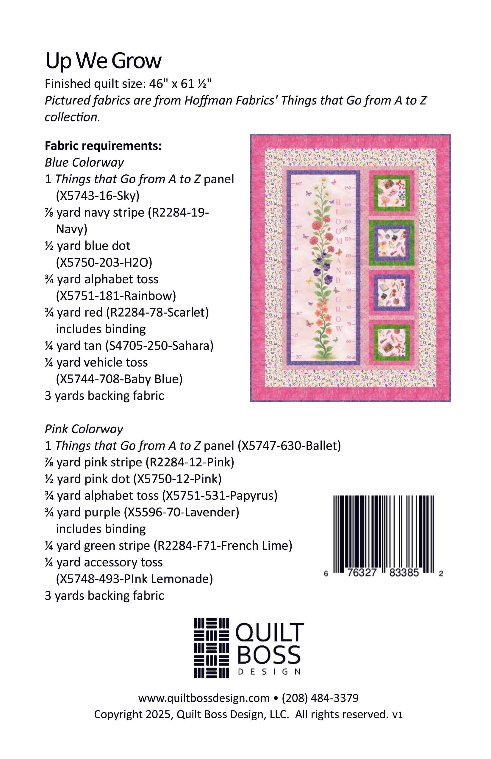Celebrate every inch of growth with Growing Up A to Z, a charming quilt pattern designed around the whimsical “Things That Go from A to Z” growth chart panel by Hoffman Fabrics. This baby-to-toddler sized quilt (46-1/2" x 61-1/2") comes in two delightful colorways to suit any nursery or little explorer. The pink version blossoms with sweet florals, twirling ribbons, and dainty dresses — perfect for a little one who loves all things pretty. The blue version takes off with airplanes, trucks, and zooming vehicles that will capture the imagination of every future pilot or driver.